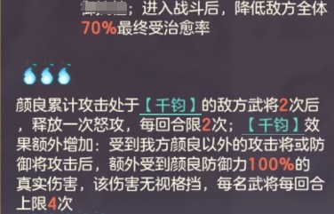 ③奇数次怒攻为列攻,叠三维+嘲讽;偶数次怒攻为排攻,打相对高额的伤害,3火后攻击卡及盾卡均提升附伤(附伤基于颜良防御力白字,青春版红豆夏侯惇)。