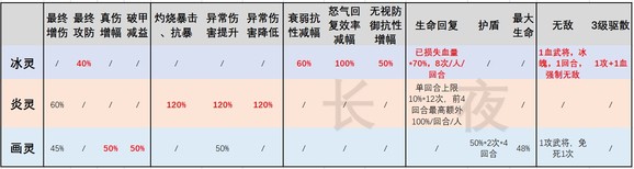 ①基础的增减伤部分中,冰灵的最终攻防基本上可以约等于最终增减伤,总体而言,第一大列的基础增减益中,冰灵几乎和画灵持平,优于炎灵;