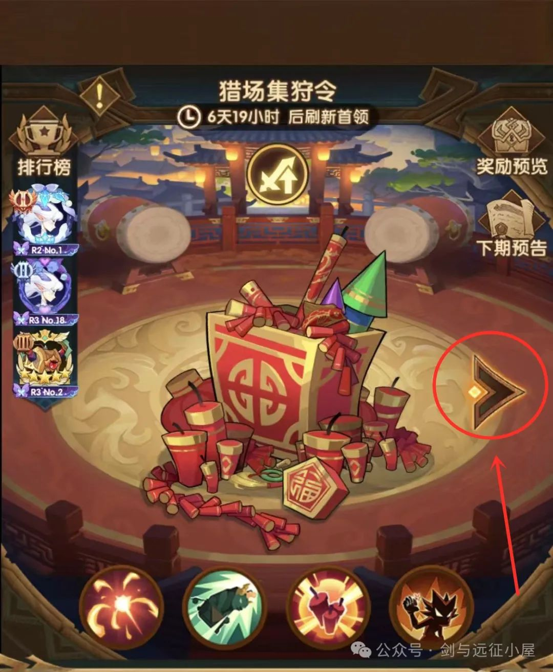 新活动常驻!公会猎场Boss第一期高伤阵容汇总剑与远征 - 攻略星发布于 05-13关注1. 本次要求为上阵英雄“不佩戴耳饰”2. 三套阵容伤害基本差不多,每期只要一套阵容,把Boss刷完所有阶段即可结束。3. 每期会随机一个特征,这个特征大概率不会对阵容搭配有要求,只对应英雄的形象。4. 别忘了“哥布林商人”和“远古剑魂”并没有消失,该刷还是要刷。 转载自:剑与远征小屋