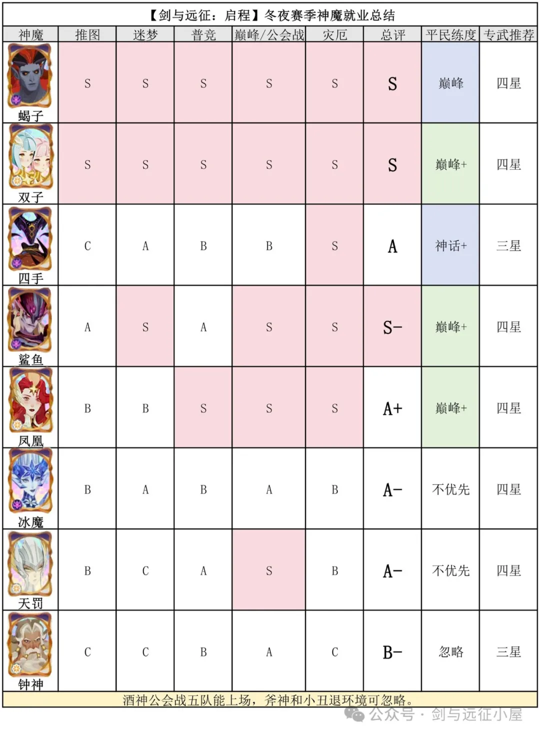 【剑与远征启程】冬夜残响赛季将于5月23日结束。今天,盒子君给大家盘点一下当前版本神魔英雄的就业情况,以作为神魔英雄培养优先度的参考。