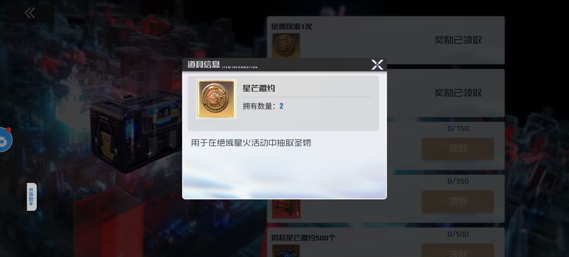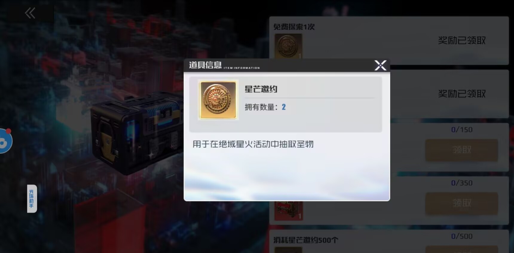 当主角45级就可以自动开启这个活动,主要就是抽圣物的卡池需要使用到专属道具【星芒邀约】抽取。