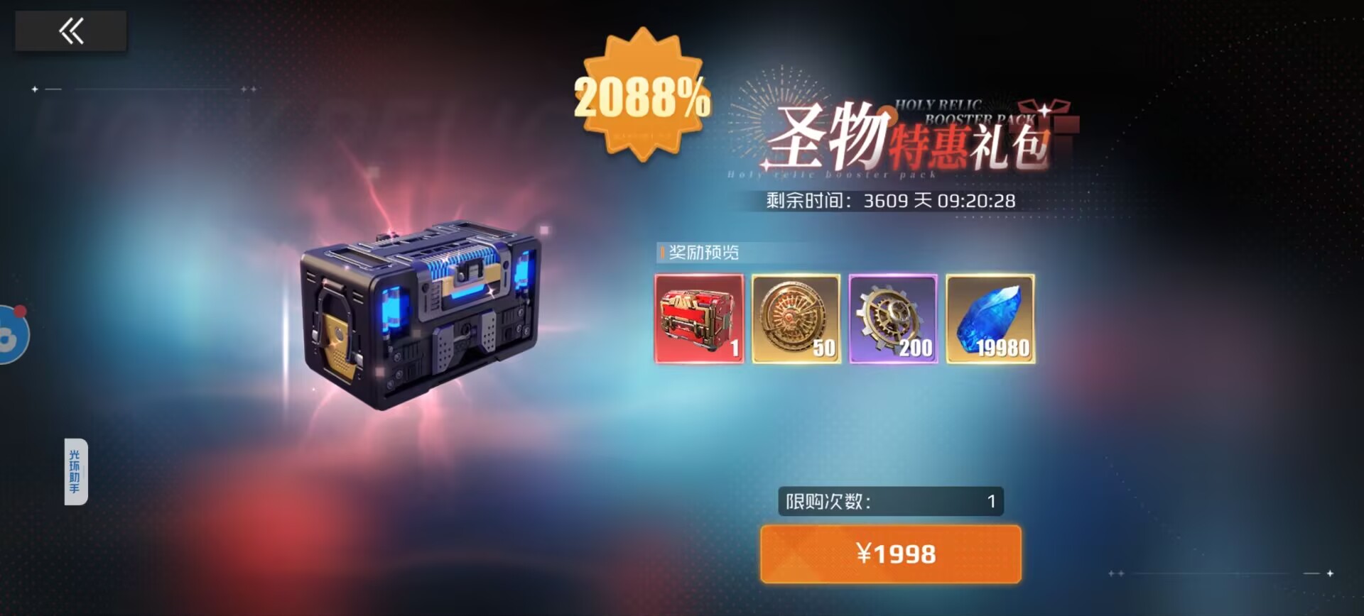 ①购买1998元礼包=50抽。