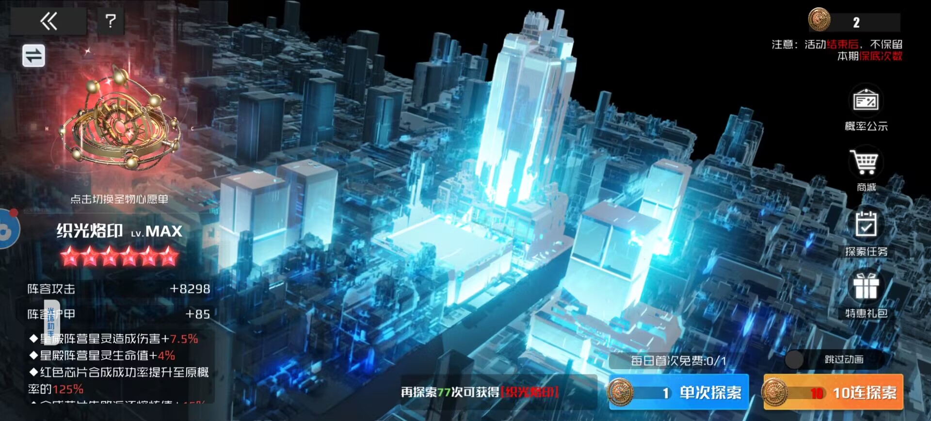 作用:织光烙印主要是提升星殿角色的伤害和生命,还能提高红色芯片合成的几率和返还的材料,这点也是非常重要的。