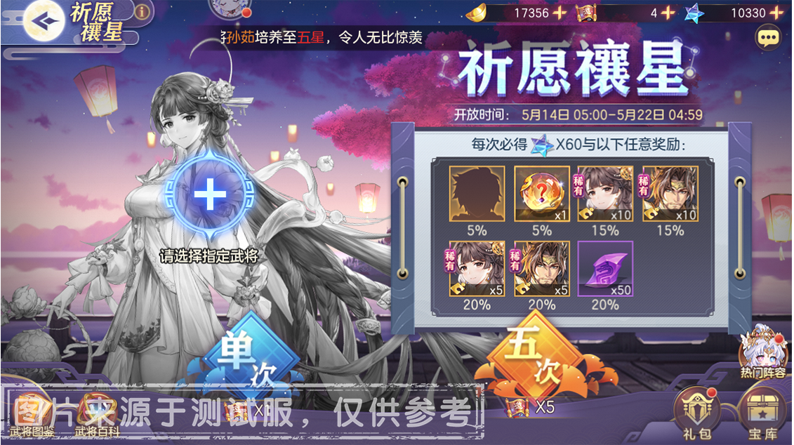 在祈愿禳星活动中,玩家可以选定孙茹、颜良进行招募,选择的武将会和其他材料一并进行抽取。