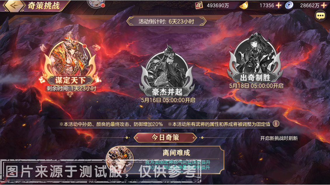 活动期间,分别在活动第1日,第3日,第5日分别开启三个阶段的奇策挑战。在本活动中,孙茹、颜良的最终攻击、最终防御增加20%,并且本活动中所有武将的属性与养成将被调整为固定值。