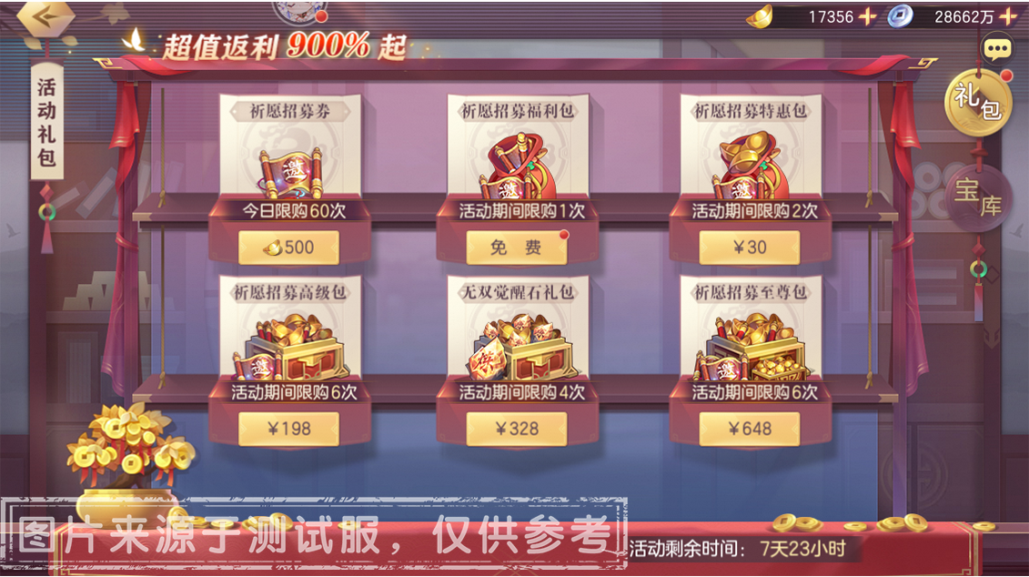 祈愿招募特惠包:内含祈愿招募券*5、元宝*300,售价30元,活动期间限购2次。