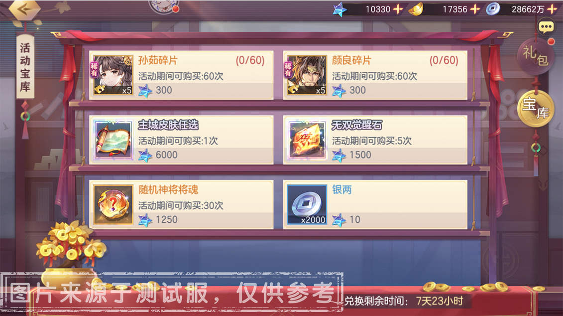 无双觉醒石礼包:内含无双觉醒石*6、元宝*3280,售价328元,活动期间限购4次。