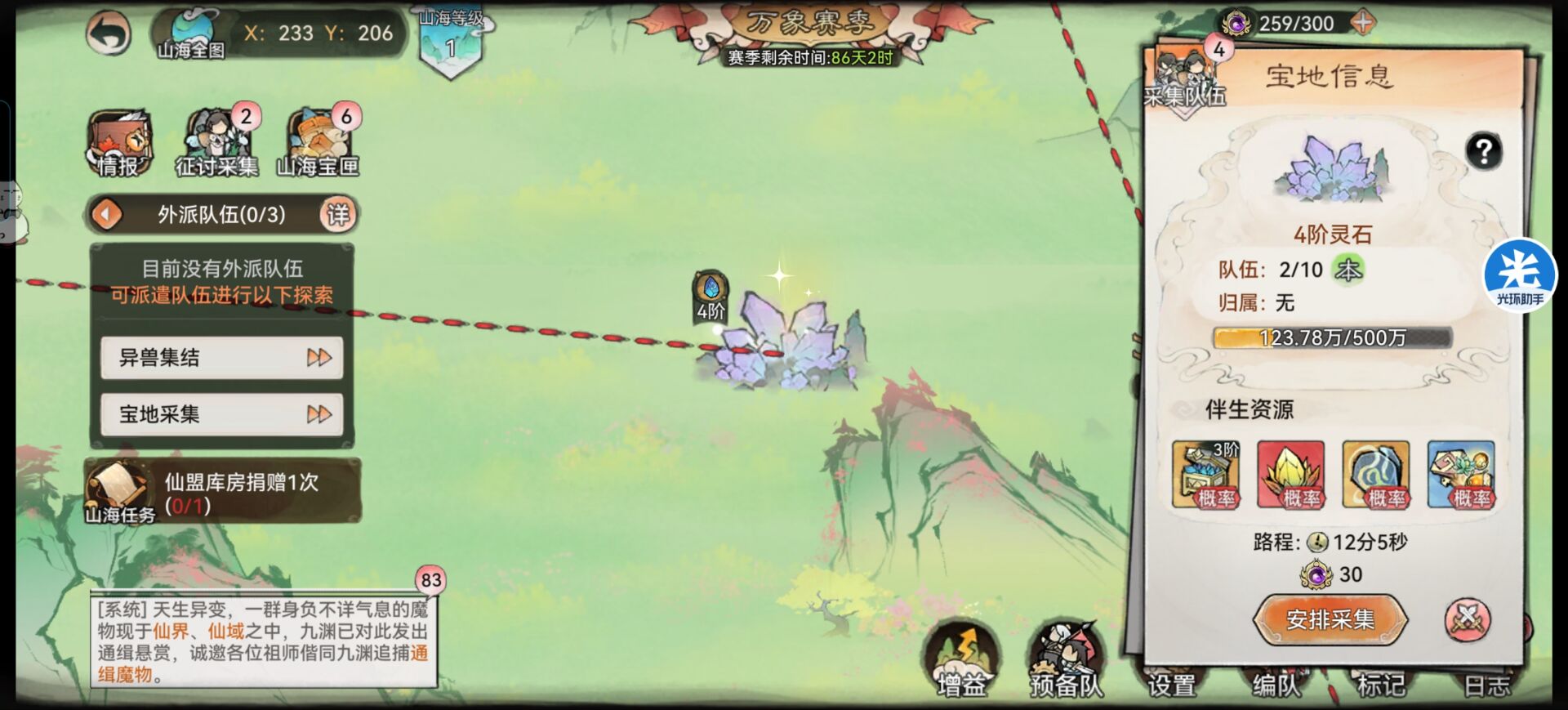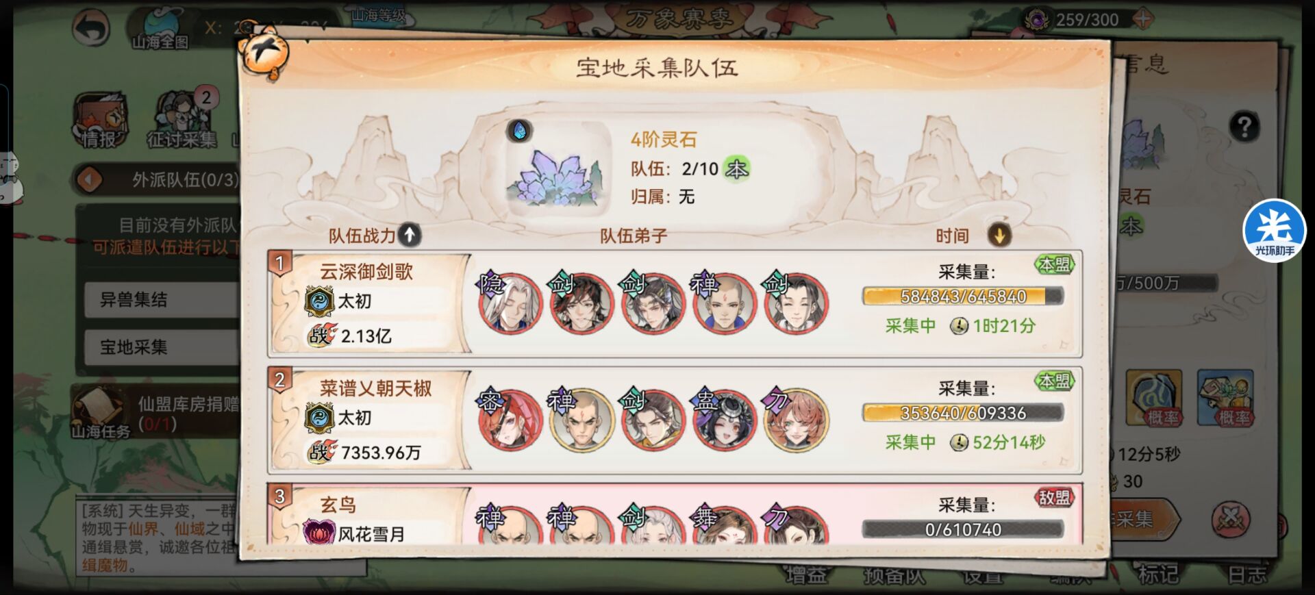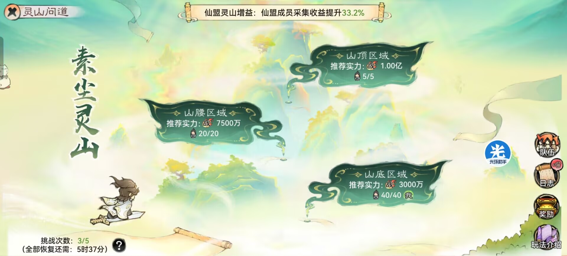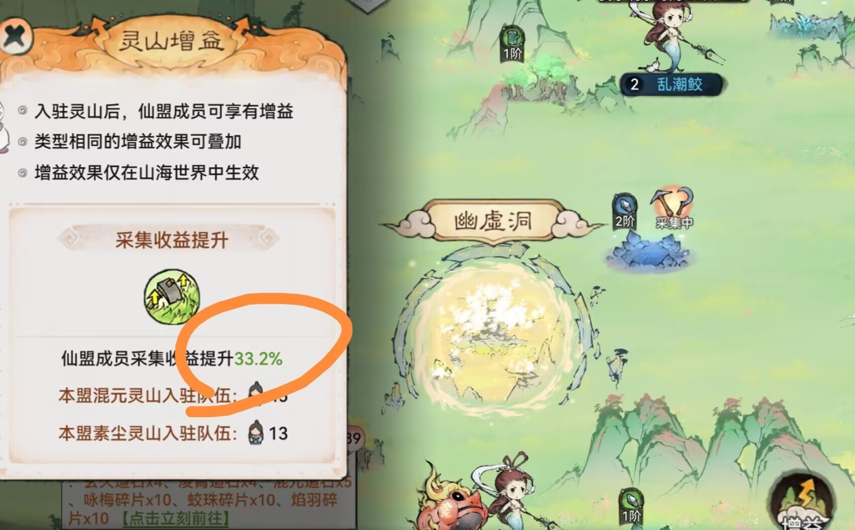 山顶区域:增加仙盟成员0.8%采集收益效率(可容纳5人)