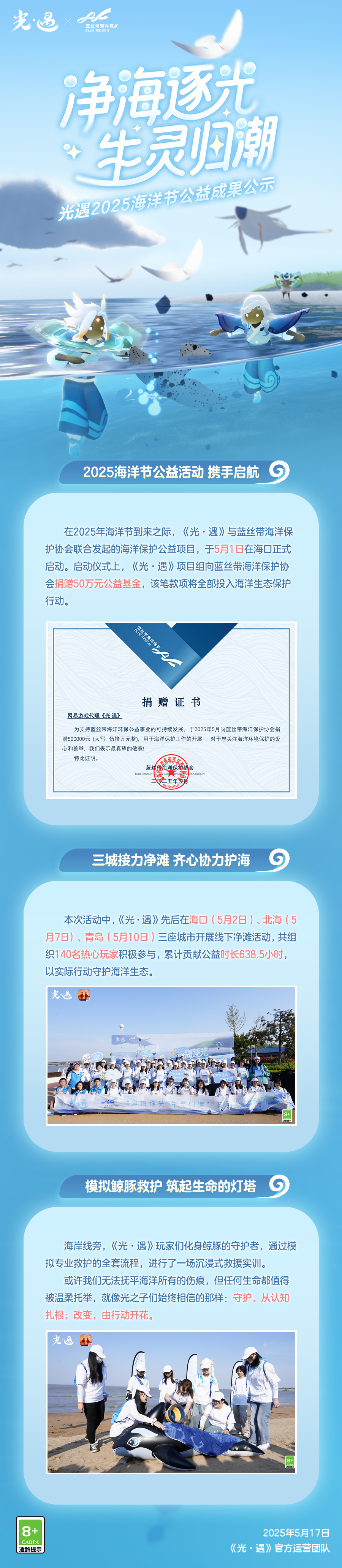 携手护海 共筑蔚蓝丨《光·遇》海洋节公益活动成果公示是泽哦发布于 05-17关注潮汐轻语,与爱同行2025年海洋节活动期间《光·遇》联合蓝丝带海洋保护协会开展系列公益活动通过举办科普讲座分享海洋保护知识在三座滨海城市启动净滩行动以模拟鲸豚救护活动传授专业救援方法让点滴行动汇聚希望与力量🐚同时,《光·遇》项目组共捐赠50万元公益款项全力支持海洋生态保护工作开展以实际行动践行环保使命守护海洋生物的家园🌊让我们一同回顾这段温暖的旅程期待未来继续携手为守护碧海蓝天贡献一份力量