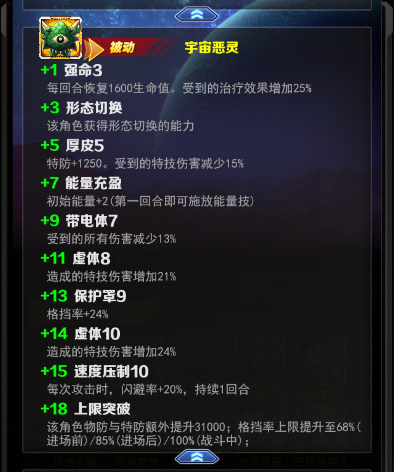 +18 上限突破:闪避率战斗中达100%,格挡率战斗中达100%。