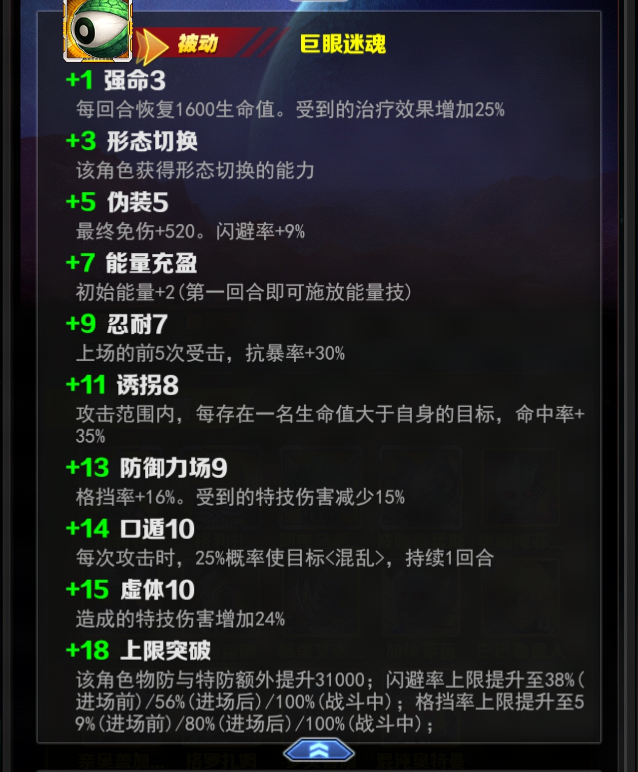- 巨眼迷魂:单体爆发(440%特技伤害)+ 控制(混乱+能量压制)