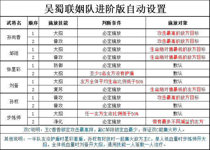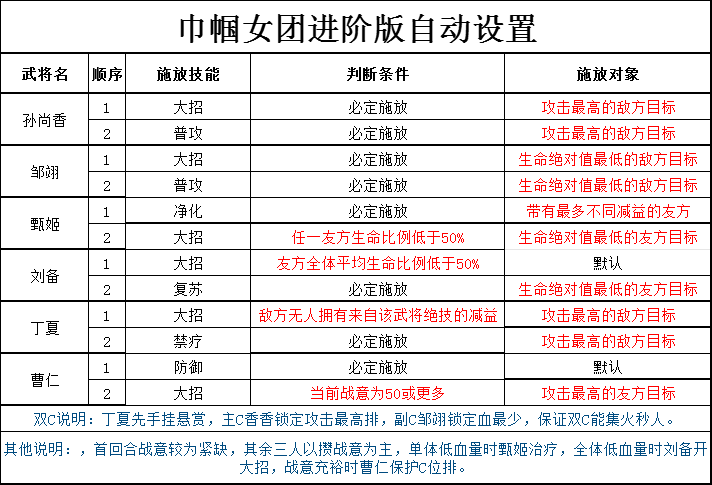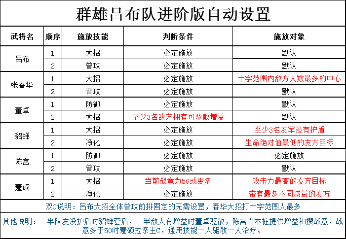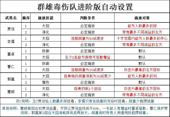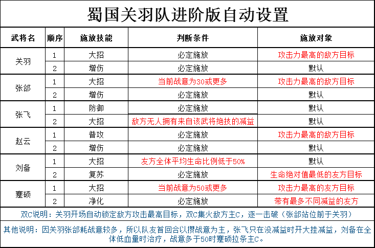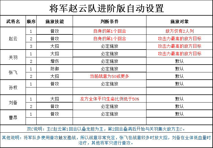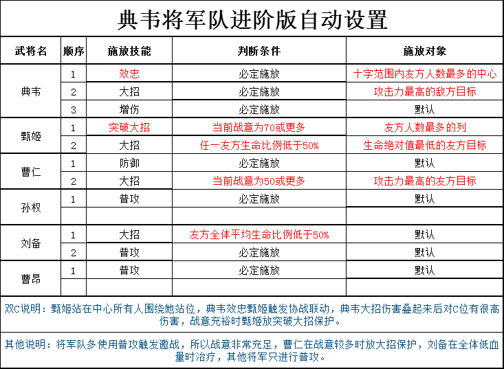 将军赵云队和将军典韦队,自动设置最为简单,战意消耗较低,有更多战意给双C施放技能。