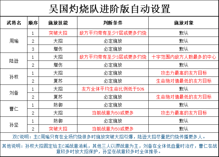 灼烧队的爆发以周瑜的突破大招为核心,其他武将尽量攒战意叠火,一波引爆直接秒人。