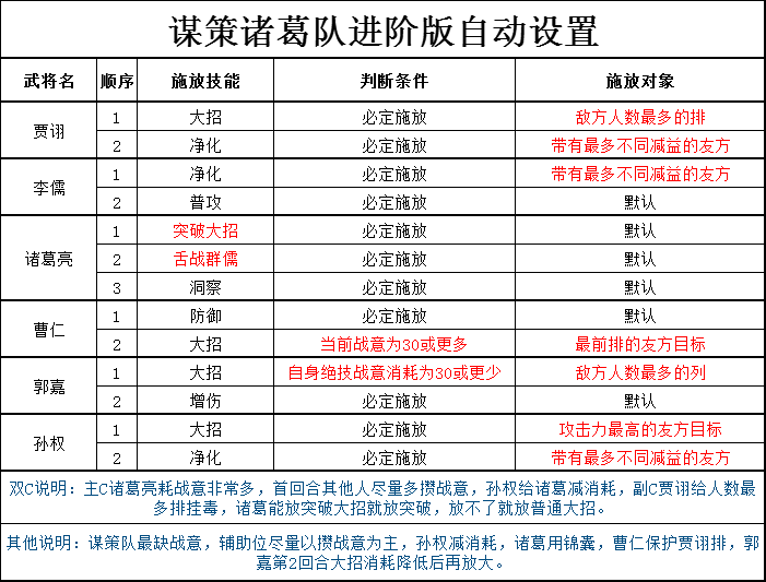 谋策诸葛队是所有阵容中耗战意最多的阵容,尽量攒战意让诸葛多放锦囊,残局中贾诩反而是制胜关键。