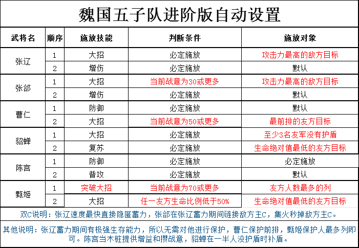 魏国版单体秒杀阵容,战斗逻辑与关羽队完全一致,只不过关羽依靠暴击,张辽依靠增伤。