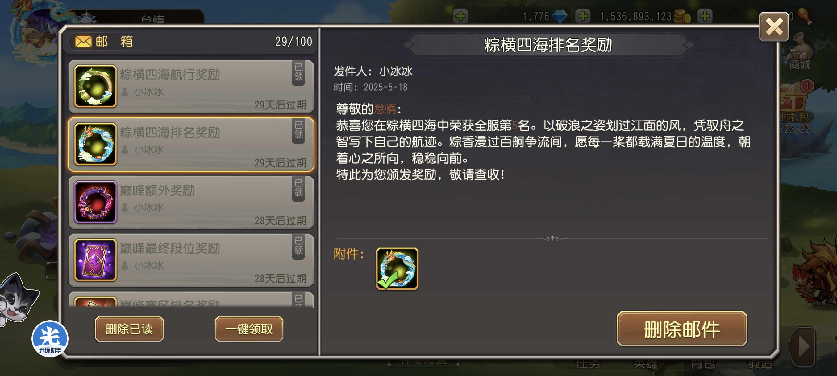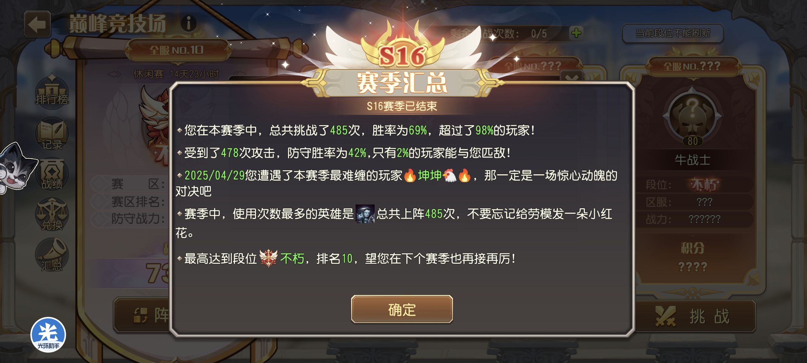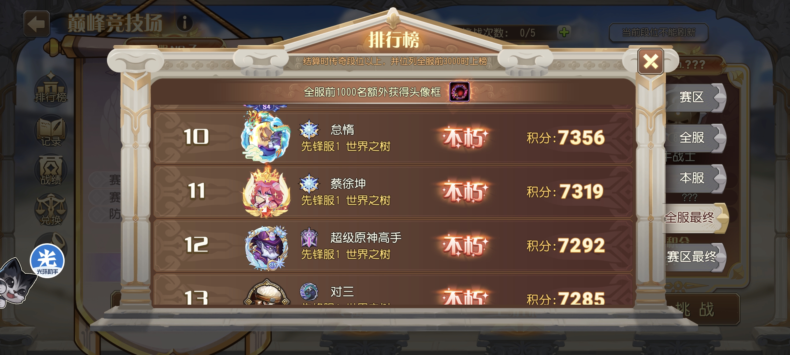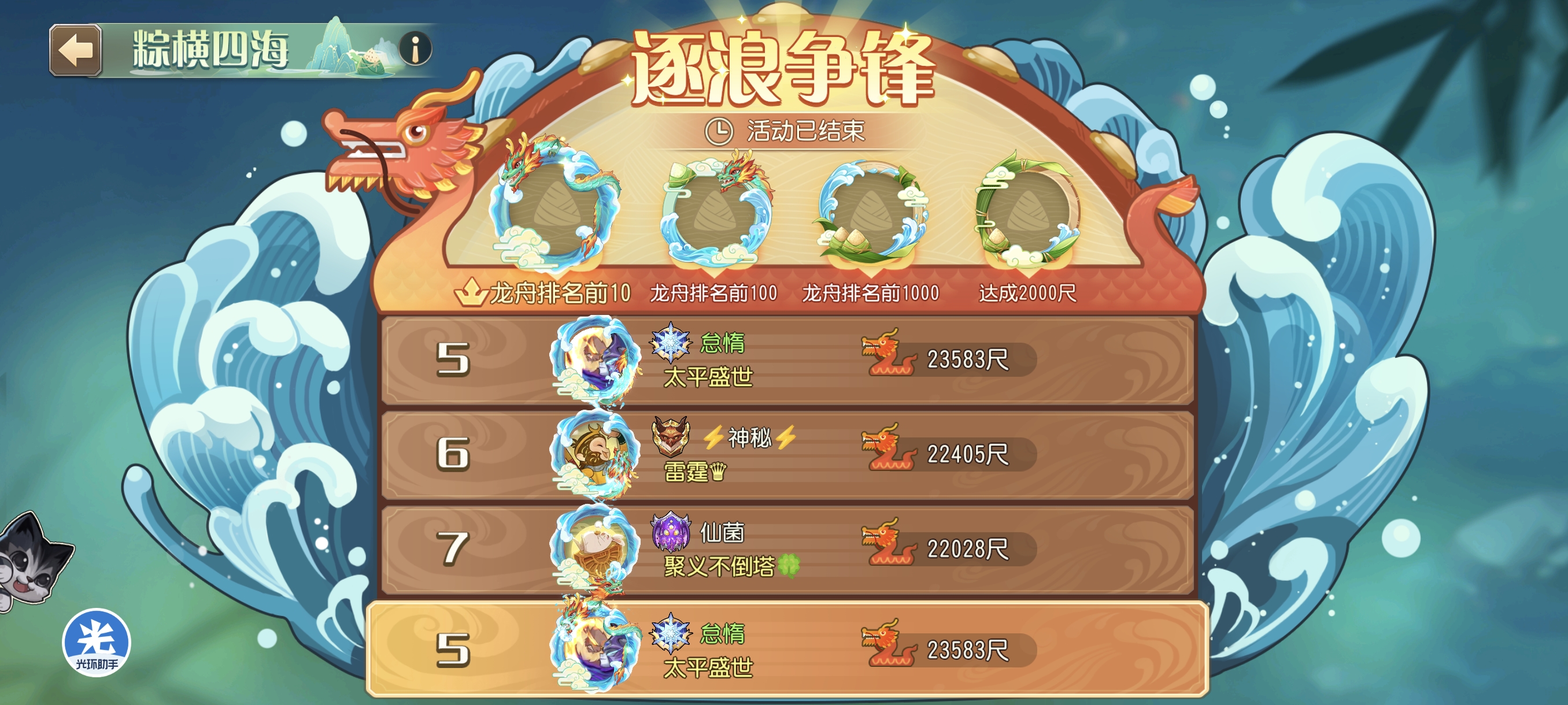 粽横四海活动拿下先锋全区第五怠惰w发布于 05-18关注 感谢太平盛世公会的兄弟们 感谢聚义公会的朋友 特别感谢酱油无敌 一票没收,全靠兄弟们给力 (吐槽,上次羽毛给了三个头像框,这次粽子给两个,下次是不是就只能拿一个了) 顺便这次巅峰也好好打了,拿到了先锋全区第10 记录一下第一次上不朽