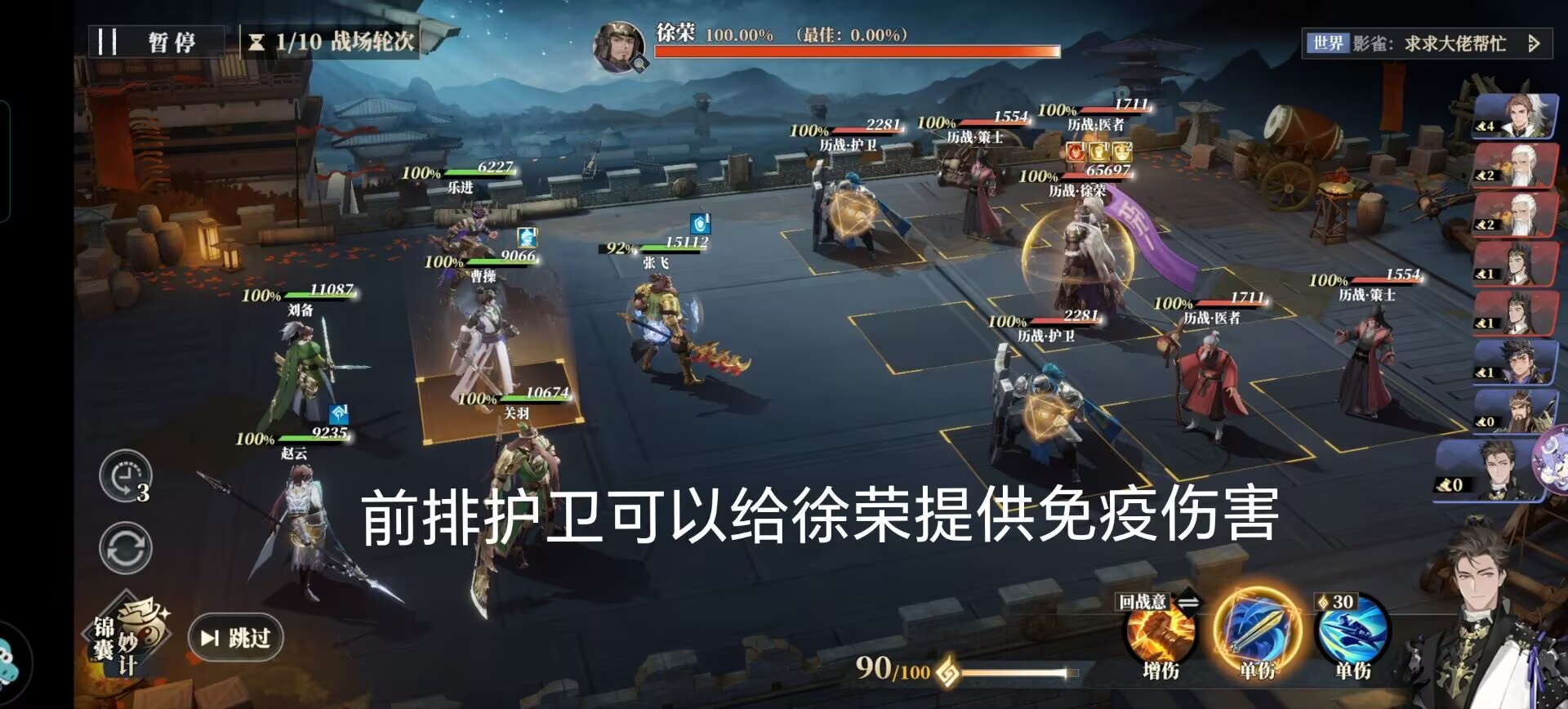 部下可以给徐荣提供增益,其中前排的护卫可以给徐荣提供【免疫伤害】的状态。
