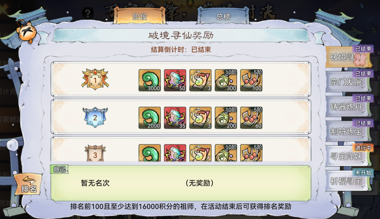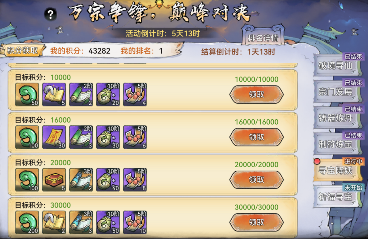 活动期间将陆续开启宗门生产、丹药炼制等阶段比拼,祖师完成阶段主题相关的操作即可获得积分。