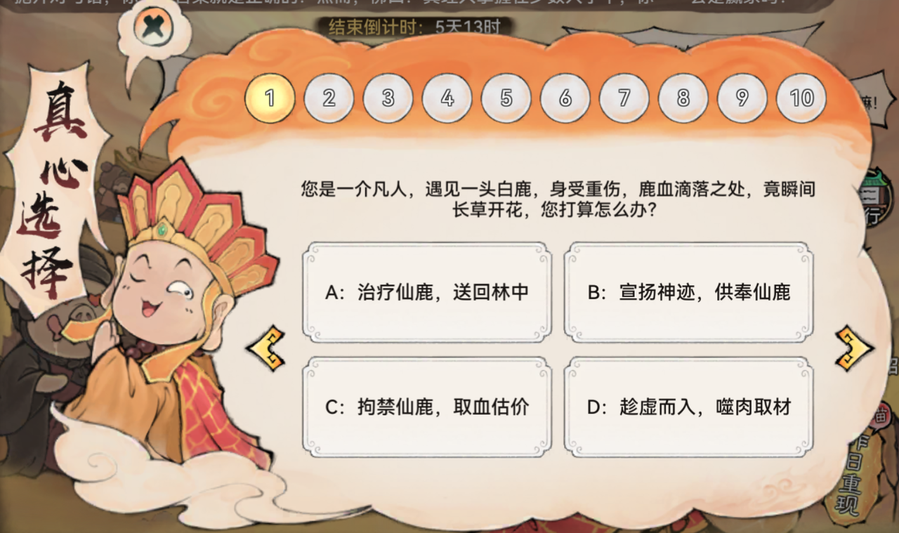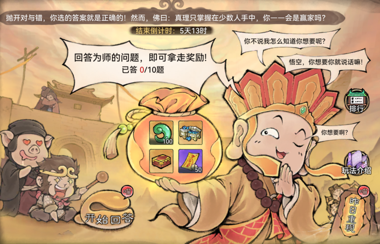活动期间除最后1日外,祖师每天都可参与一次真心话问答,获得灵玉等答题奖励。