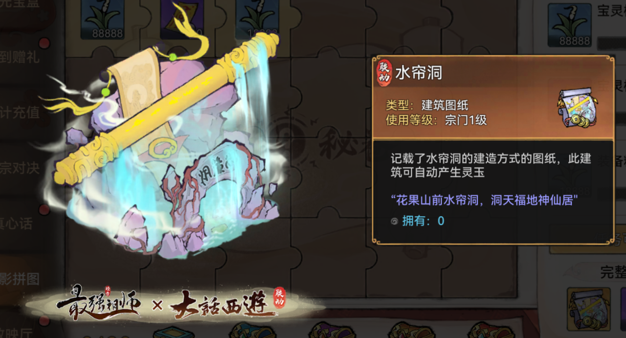 累计完成一定数量的任务或是完成整张拼图还可获得建筑图纸-水帘洞、寻仙令等奖励。![]()