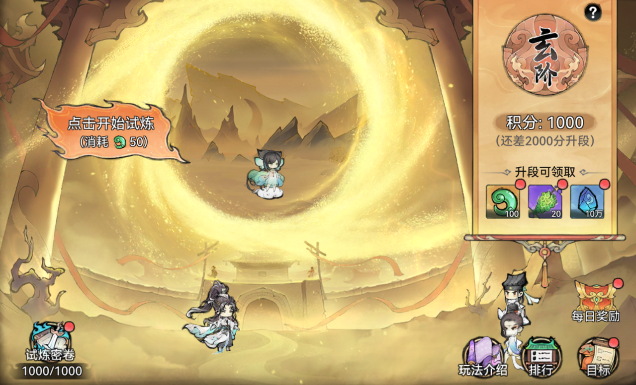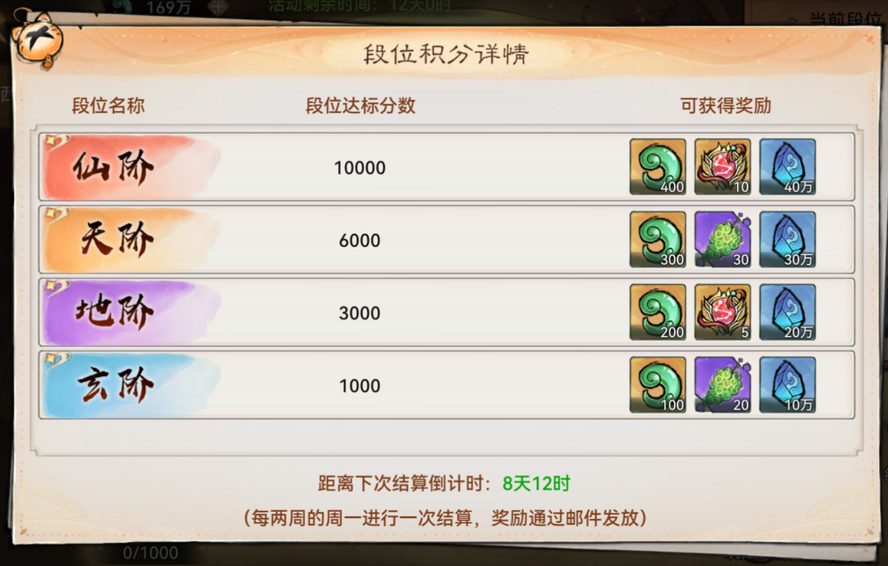 每次历练结束后将会根据试炼进度结算活跃积分和段位积分。累计活跃积分可解锁试炼密卷奖励,累计段位积分则可获取寻仙令等段位奖励和取经宝匣等段位积分排行奖励。![]()