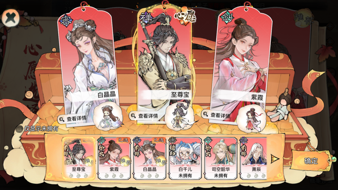 祖师可以自行从弟子至尊宝、紫霞、白晶晶,以及胡十三娘、敖天、苜蓿、石僧、卫寒等弟子中选择3人作为可抽取的弟子,并且可以在选定的3名弟子中,选择其中1名弟子作为心愿弟子。