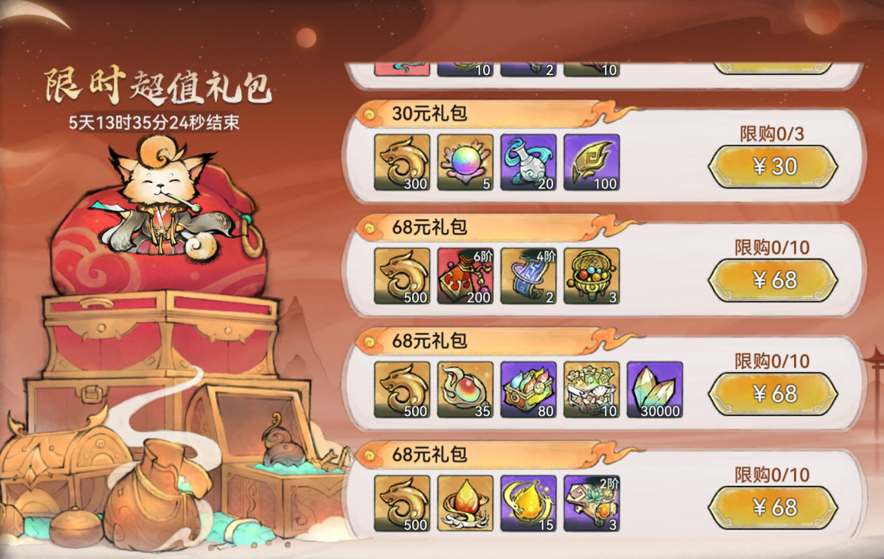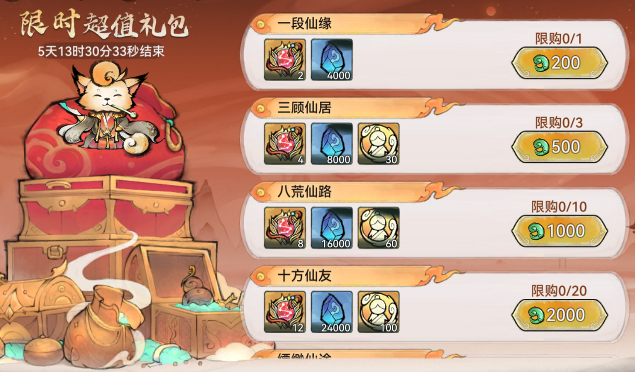 除消耗寻仙令外,祖师也可以购买限时礼包和灵玉礼包来获取仙缘值。![]()