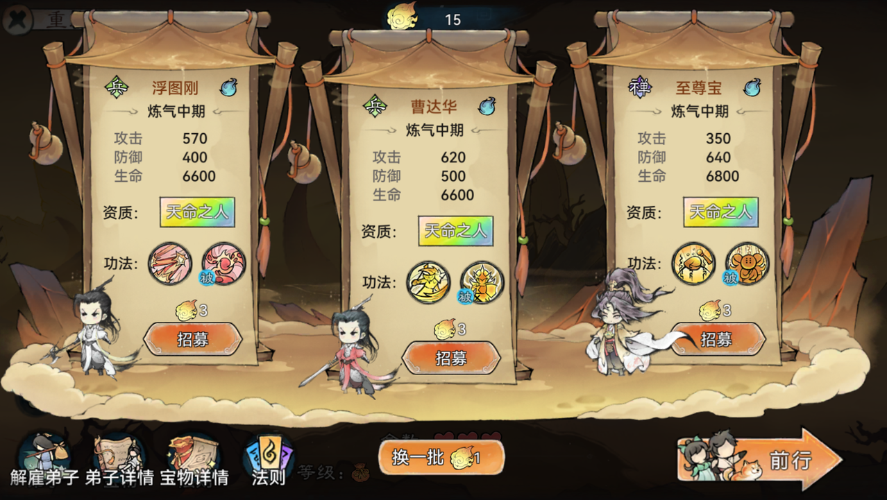 活动期间,祖师需要从玩法中招募弟子进行历练探索,探索过程中会遇到各种事件,完成事件可获得法则/装备等玩法道具,祖师可以合理选择搭配提升试炼队伍实力,以推进探索进度。![]()