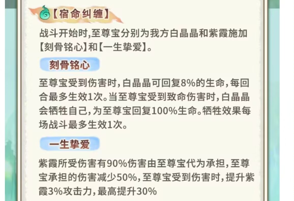 刻骨铭心:至尊宝受到伤害,白晶晶可回8%生命,同时如果至尊宝死亡,白晶晶会牺牲自身复活满状态的至尊宝。