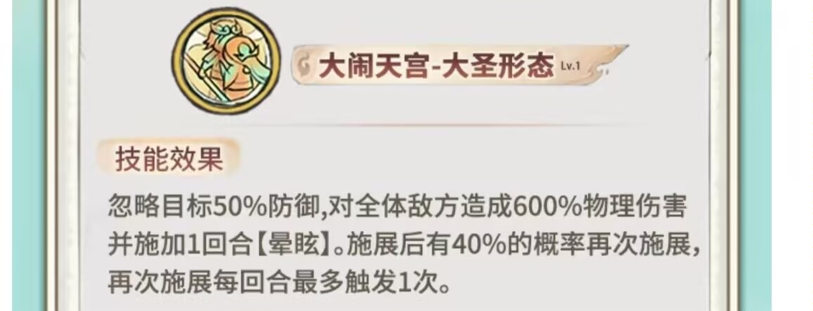 这个形态下至尊宝自带忽视目标50%的防御加成,同时对敌方造成600%的倍率的物理伤害并施加1回合的眩晕。