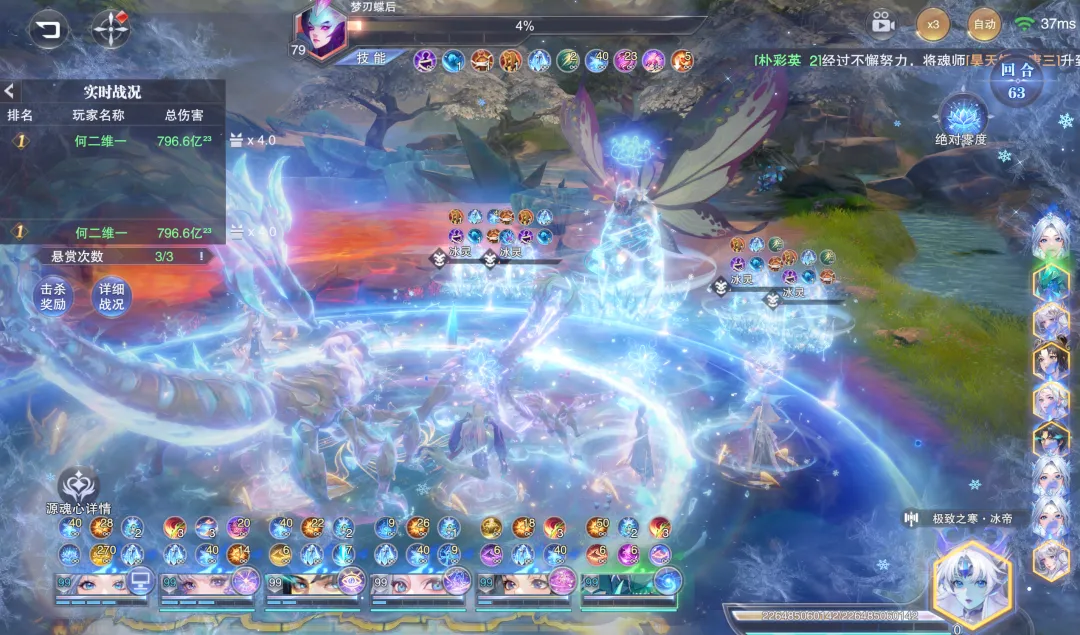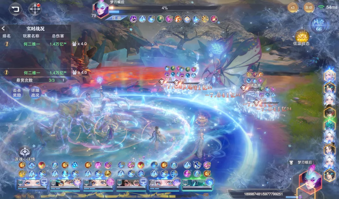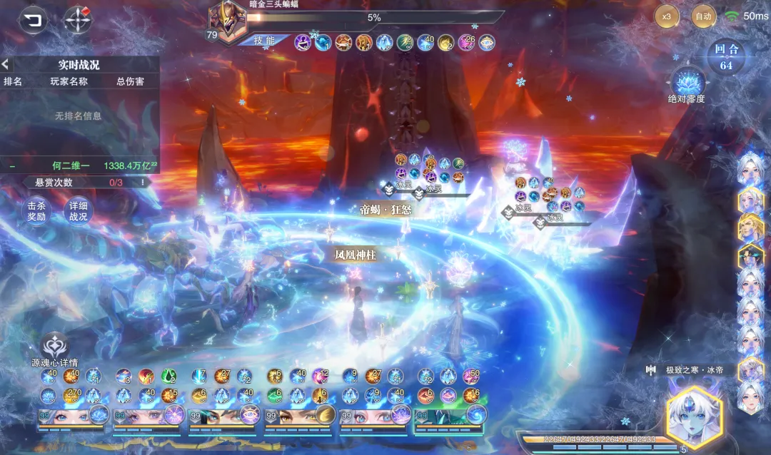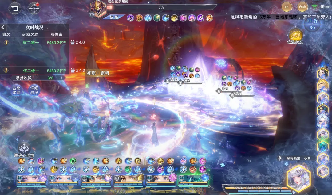 首先还是放一个双控三辅的阵容伤害摆这给大家做个伤害模板,这个阵容的伤害约为5000亿²¹,其中上图中的这个阵容有SP雪帝+SP霍雨浩+SP白沉香+暗器唐雅+SP小白组成,吃鱼是吃到了4条鱼,其余则基本上都是最优条件,此外如果把阵容中的SP雪帝给换成原本接近满配的SP阿银的话,这个阵容的伤害还会提升约300倍左右,达到150万亿²¹上下,大家可以先略作参考。