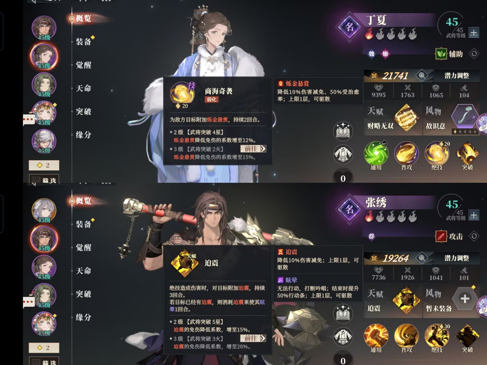 因此可以根据自身的需求考虑上一些减敌人免伤的武将。比如:丁夏和张绣。