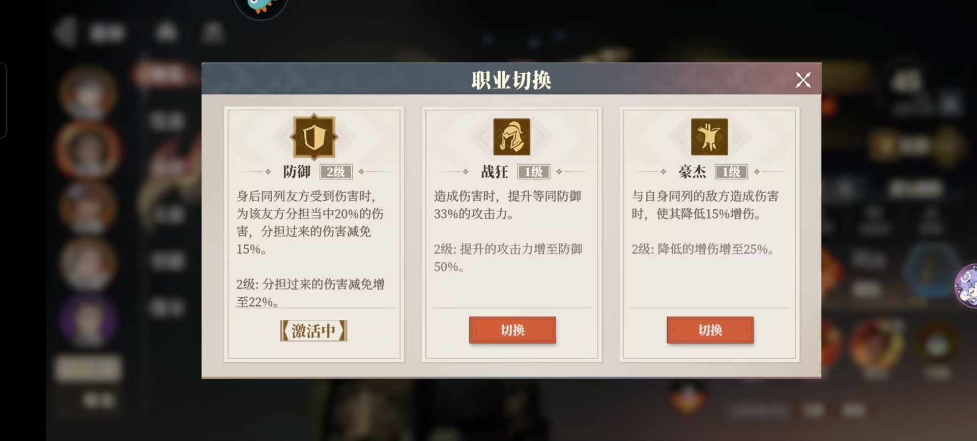 又比如:考虑到武将的职业,前排肉盾职业如果是选:豪杰或者是防御。那么也可以站一列。