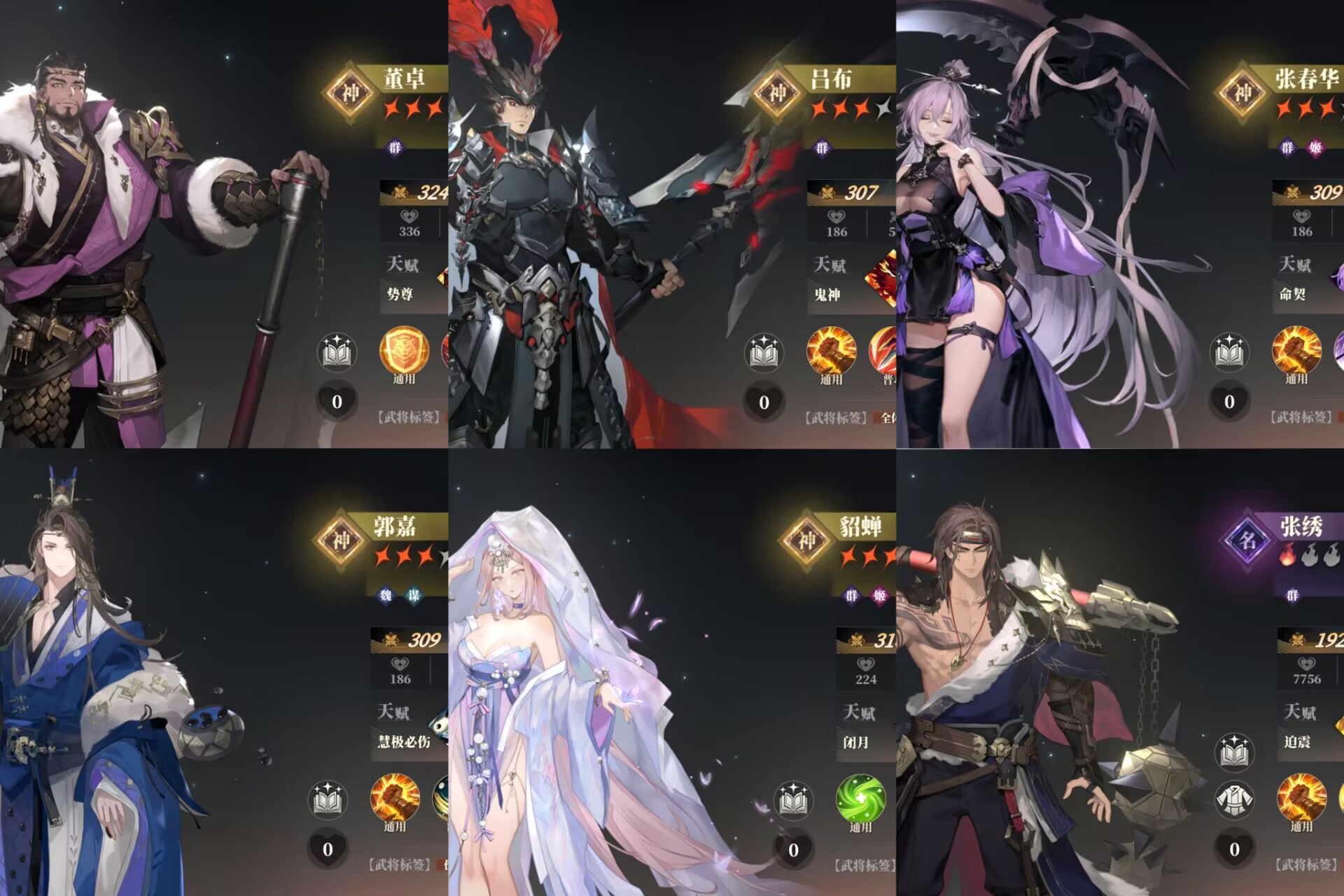 ②群雄吕布队。董卓+春华+吕布+郭嘉+貂蝉+张绣。