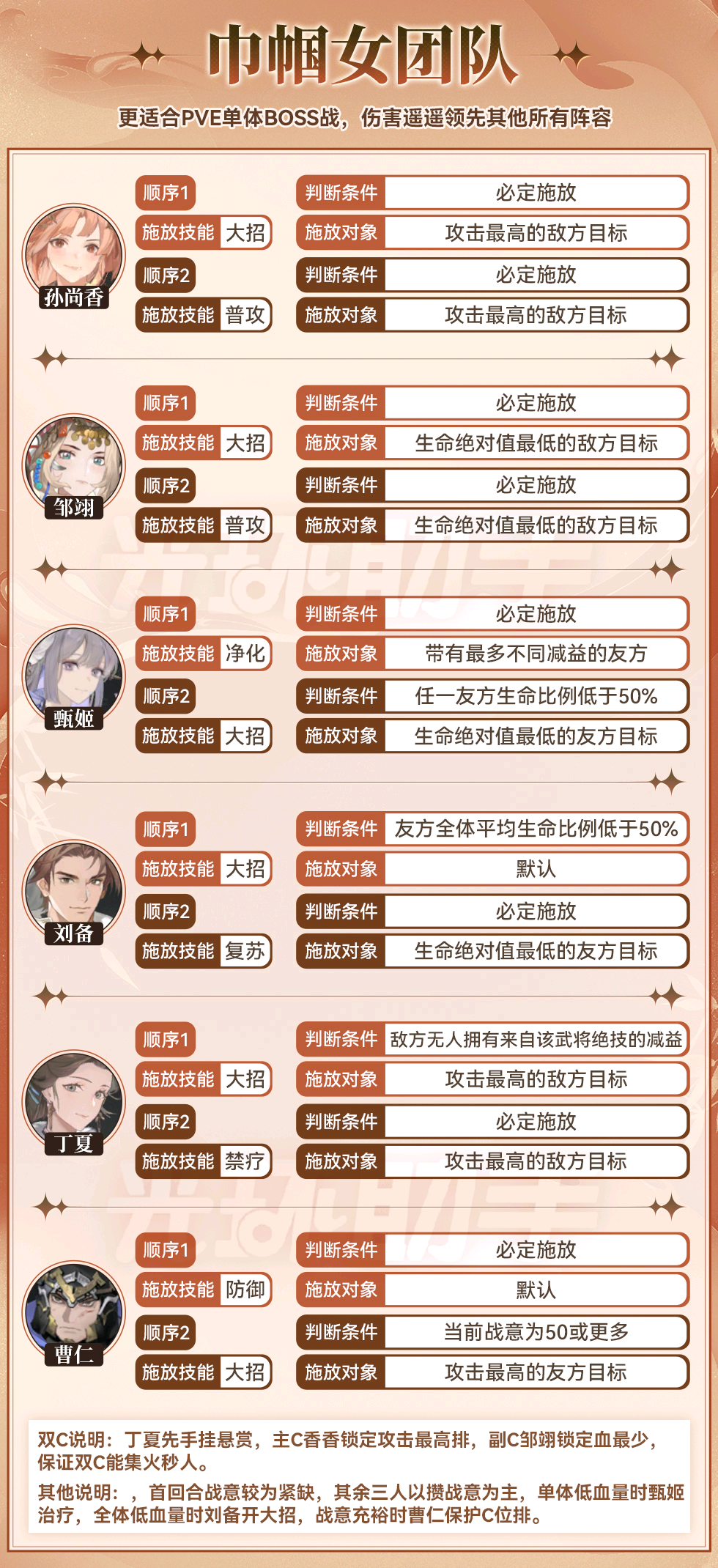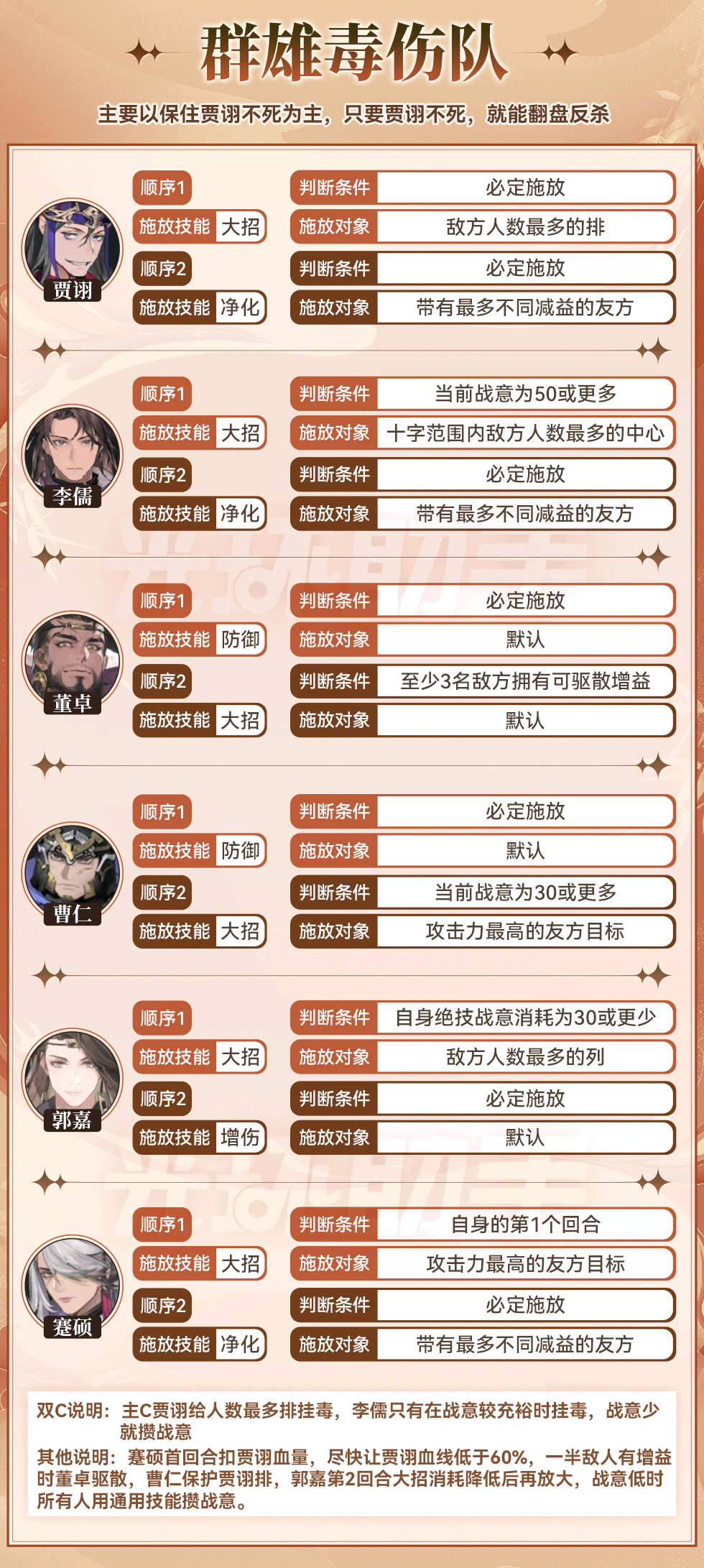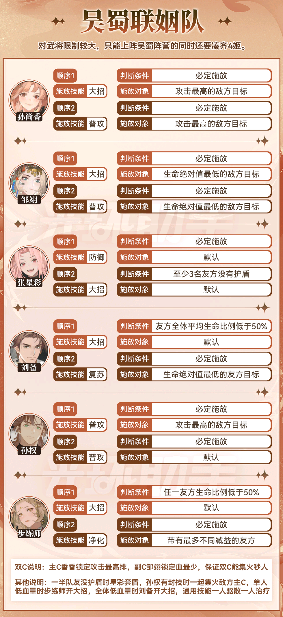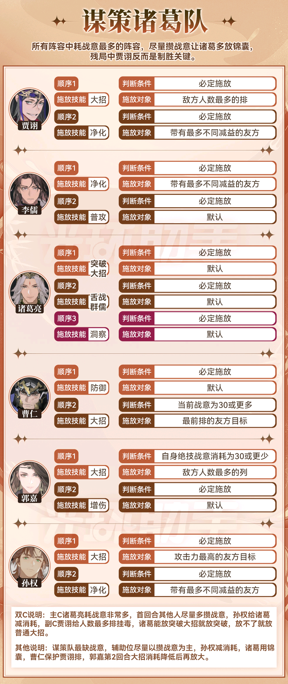 类似郭嘉,参考谋队郭嘉的设置,大招消耗≤10,对主C放大招,否则就普攻