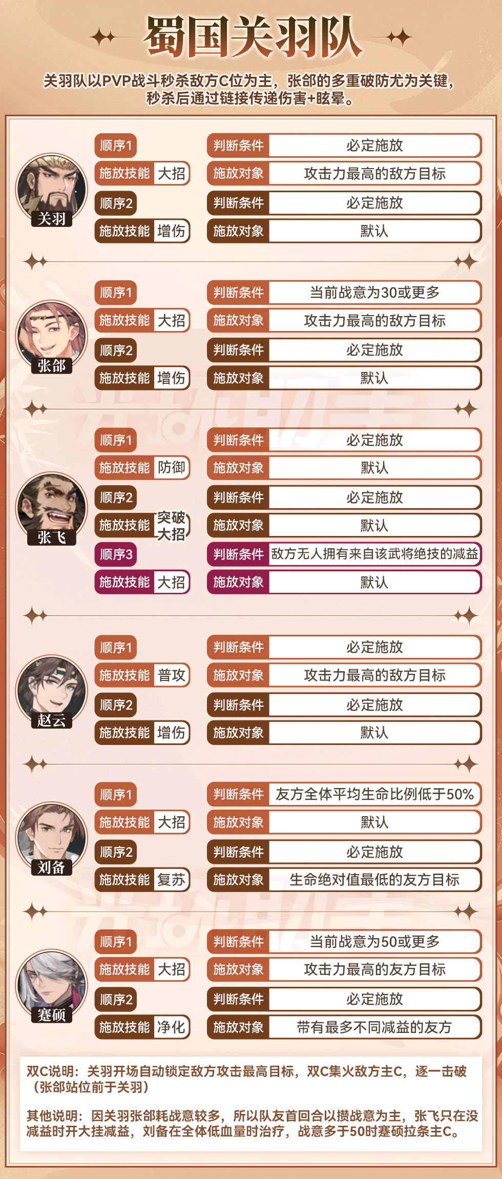 其他人的都可以从上面抄,需要的无非就是香香和关羽搭配时他俩的自动设置。 香香的只需要改施放对象,可以选择后排或前排都行。然后关羽打血量百分比最少的,这样他俩的输出就能集中,他俩都最优先必定放大招。 无论是先秒前排还是后排都可以,后排的话香香转职神射手。