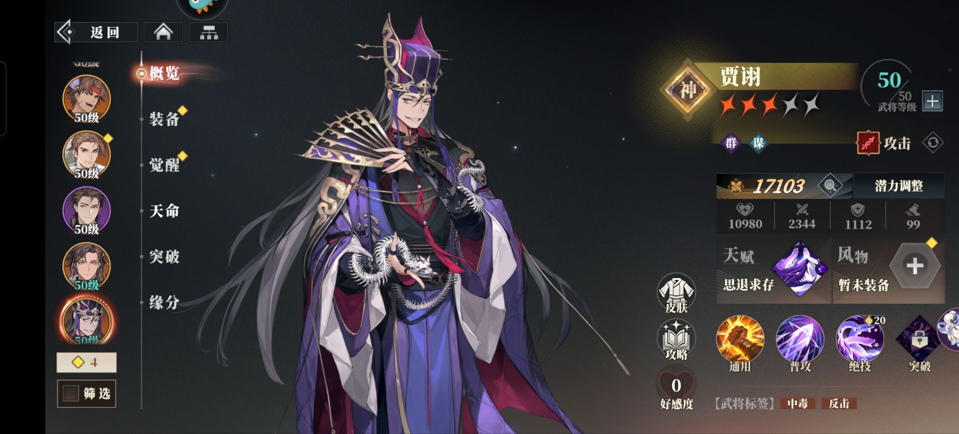 ③贾诩:间接伤害+伤害减免+抗暴率。