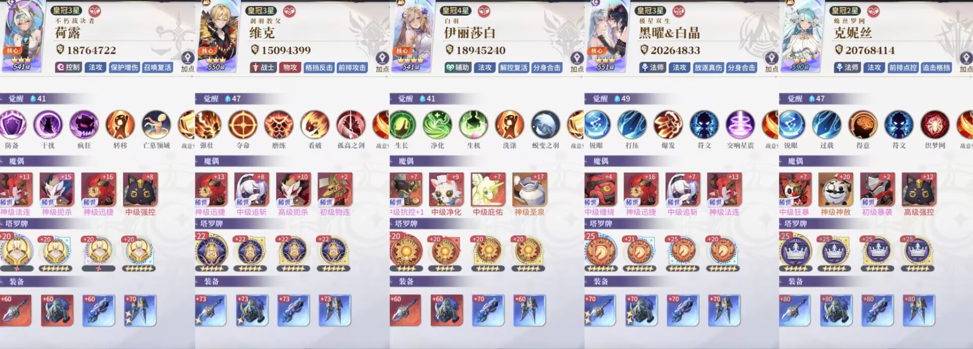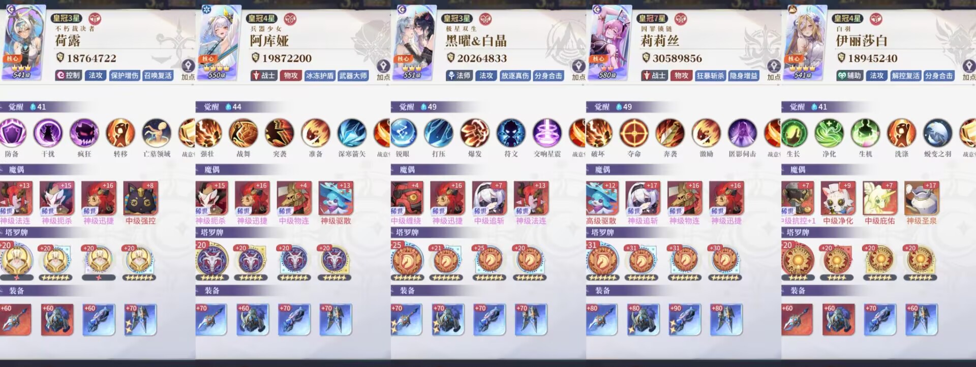 伊丽莎白提供解控治疗和复活,配合买买提雅和荷露提供无敌增伤整体阵容生存输出续航兼备。