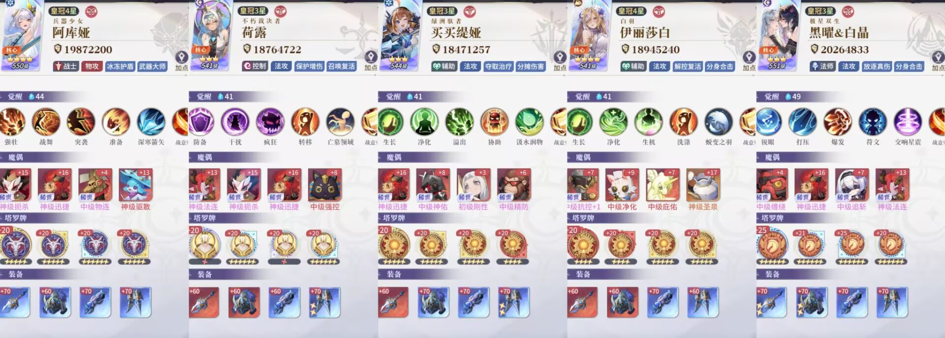 阵容强度自然不需要多说,阿库娅配合黑耀白晶能够迅速压低敌人的血仙,莉莉丝后手全体斩杀收割。