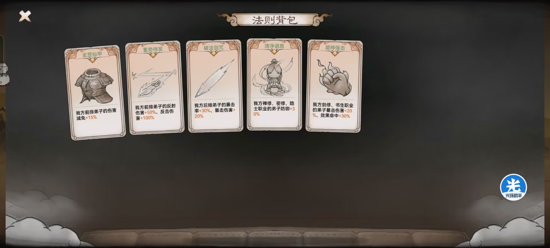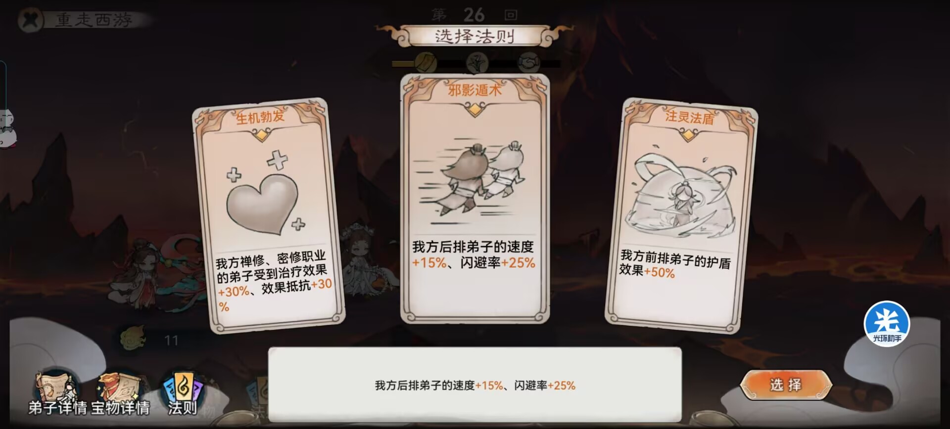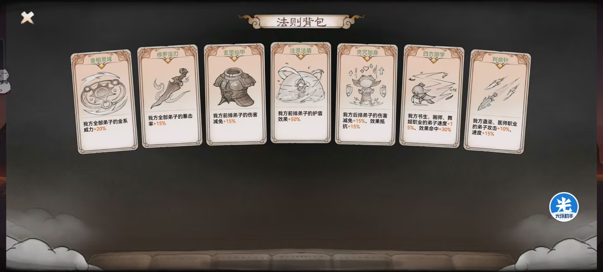 ①注灵法盾:提升我方前排弟子的护盾,至尊宝可以加护盾所以这个法则很重要,可以极大提升前排的生存。