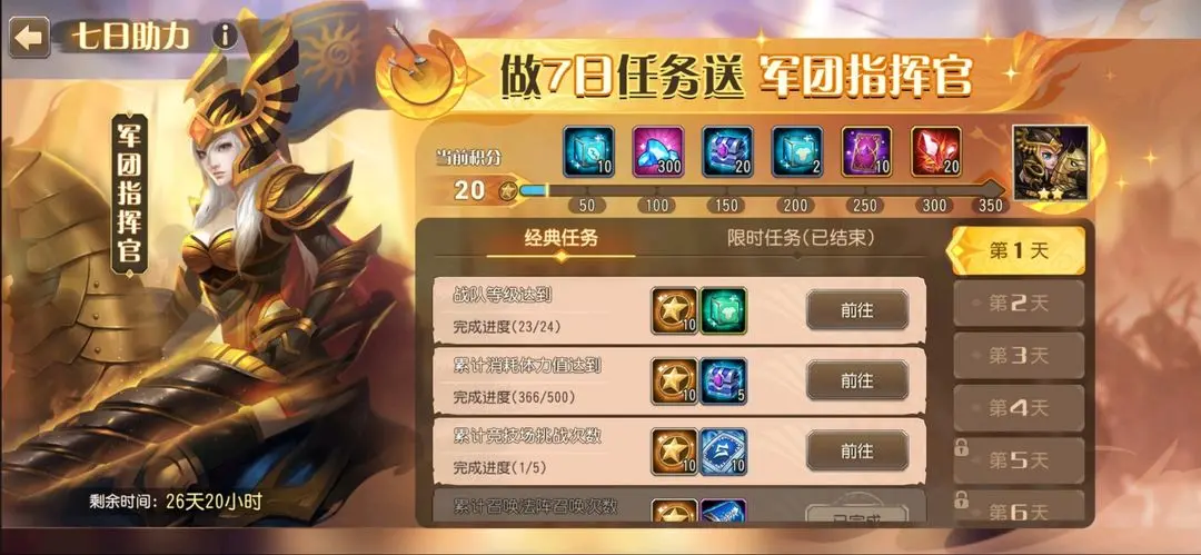 队长们6级之后就可以解锁7日助力活动,每天完成任务可以领到10抽+最高3100钻+二星英雄军团指挥官。7日助力活动不光会一直给队长带来奖励,每一个任务也相当于给队长的成长指引。