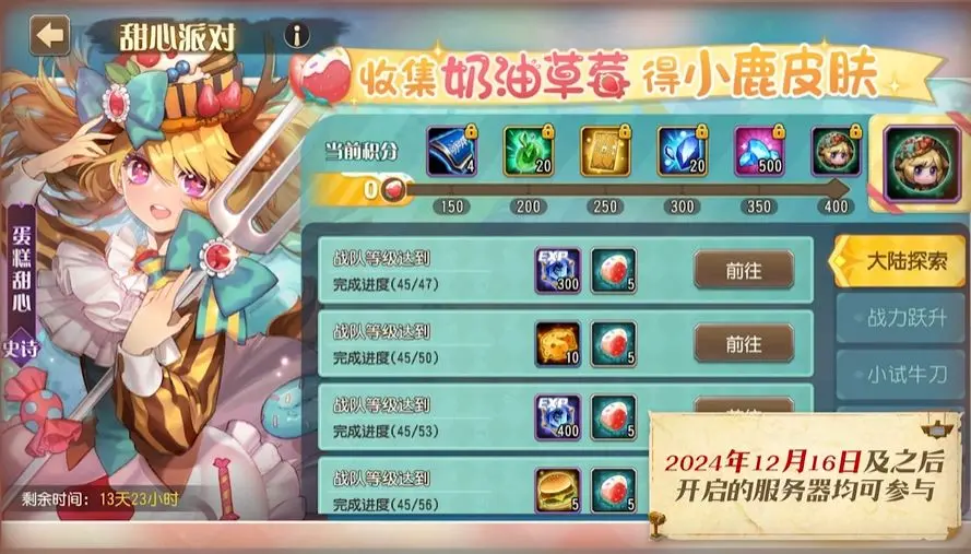 等队长达到45级之后,还可以解锁甜心派对活动!完成活动收集奶油草莓不光会有召唤券和钻石奖励,还会有小鹿的史诗级皮肤“蛋糕甜心”可以领取。快把这么可爱的小鹿带回家吧~