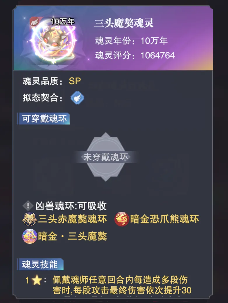 第一个是240抽保底的敏攻系幻彩魂灵,三头魔獒魂灵,反正幻彩魂灵在首次或第一次返场上线时的成本都是非常夸张的......这次当然也不例外,之前维一也给大家做过有关于幻彩魂灵的实测攻略,其最大的意义是可以让我们多带一个凶兽RMB魂环,这样便能够大幅提升我们的属性与额外享受一个凶兽魂环的实战增益,不过鉴于此次较高的成本大家还是量力而行吧......