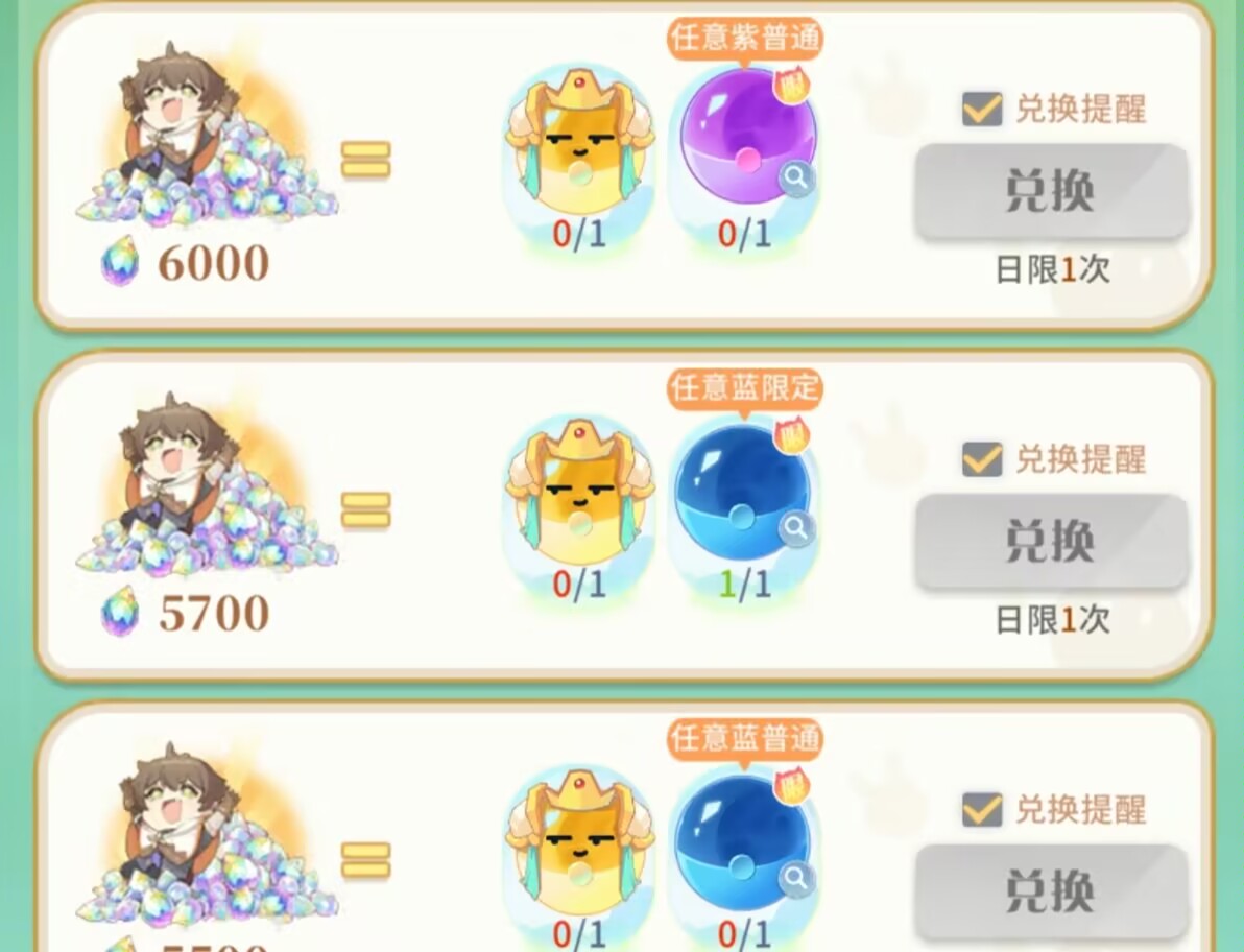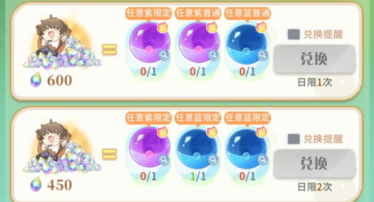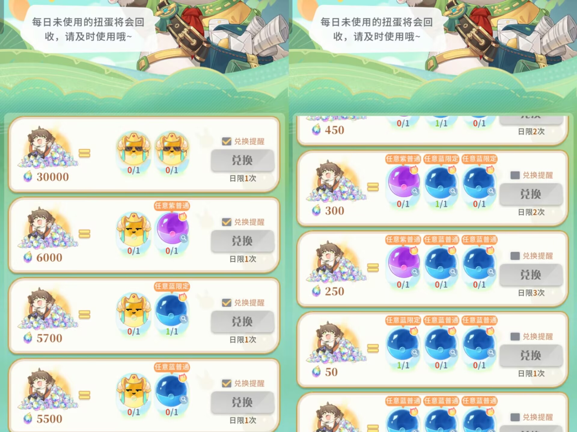 ⑥任意紫限定+2个蓝色限定蛋=450钻石。
