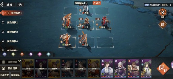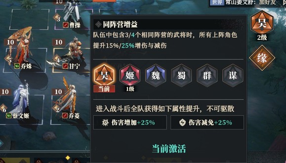 常规4张同国籍卡激活全队25%增减伤光环,因此配队时,火队应优先设置4张吴国卡,或者4张女卡,或者4张谋卡。已确定位置的2张核心卡周瑜陆逊,阵营为吴/谋。