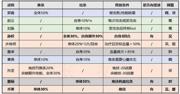 2、上文已经说过,推拉条及速度属性高贵,那么我们看看技能中含推拉条有哪些角色(优选吴/谋/姬):