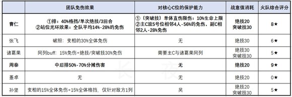 由于后续有限定谋卡和姬卡的副本,因此在最后摇摆位的选择上,想要兼顾pve,火烧需要尽量在摇摆位选择谋卡或者姬卡,并且功能性上,需要作为团队辅助位来呈现,核心的功能应类似副T,依旧是增加团队的免伤能力,以及对双C的保护,也可以辅助治疗来提高周泰的生存。