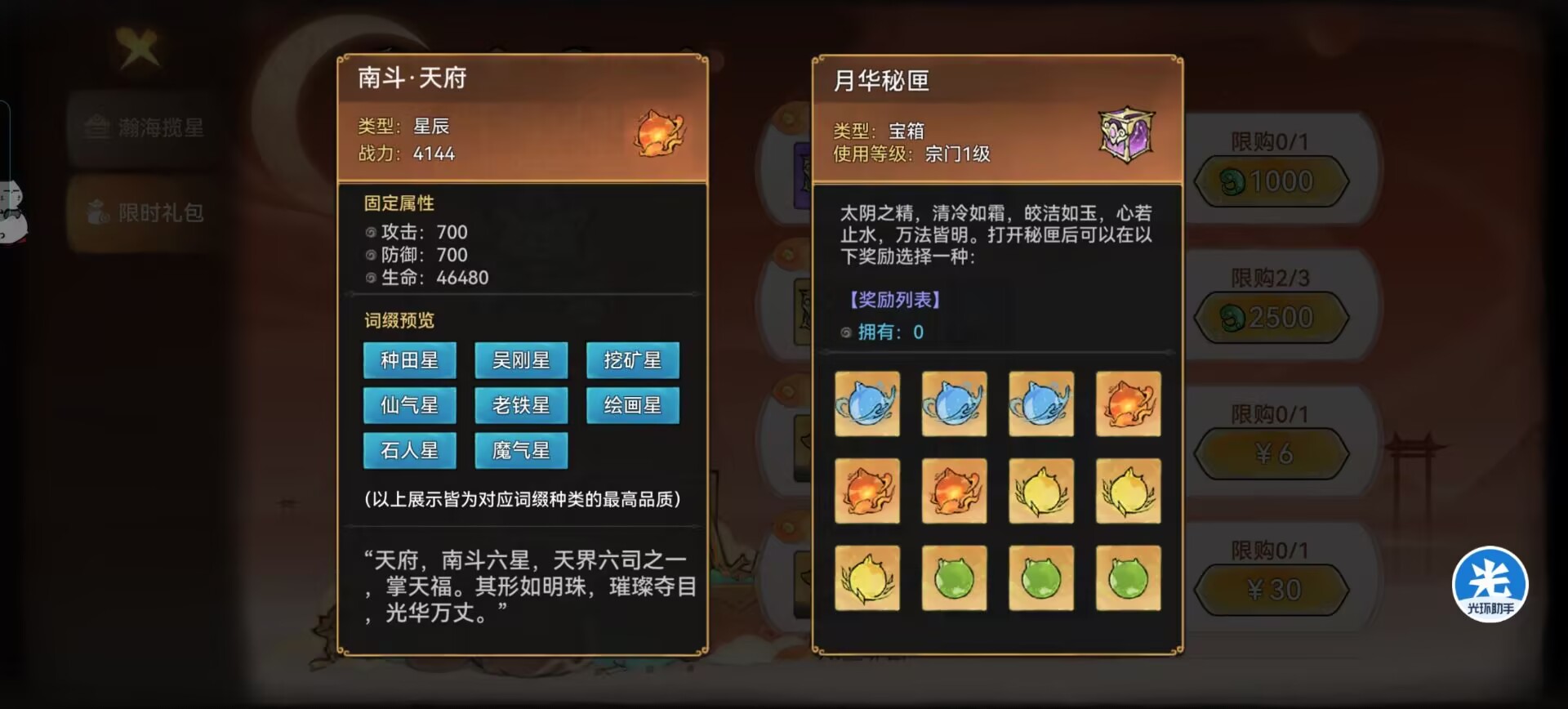 2:南位置的星辰是:南斗星辰。①作用:这个位置的星辰主要是提升我们宗门的产量的。