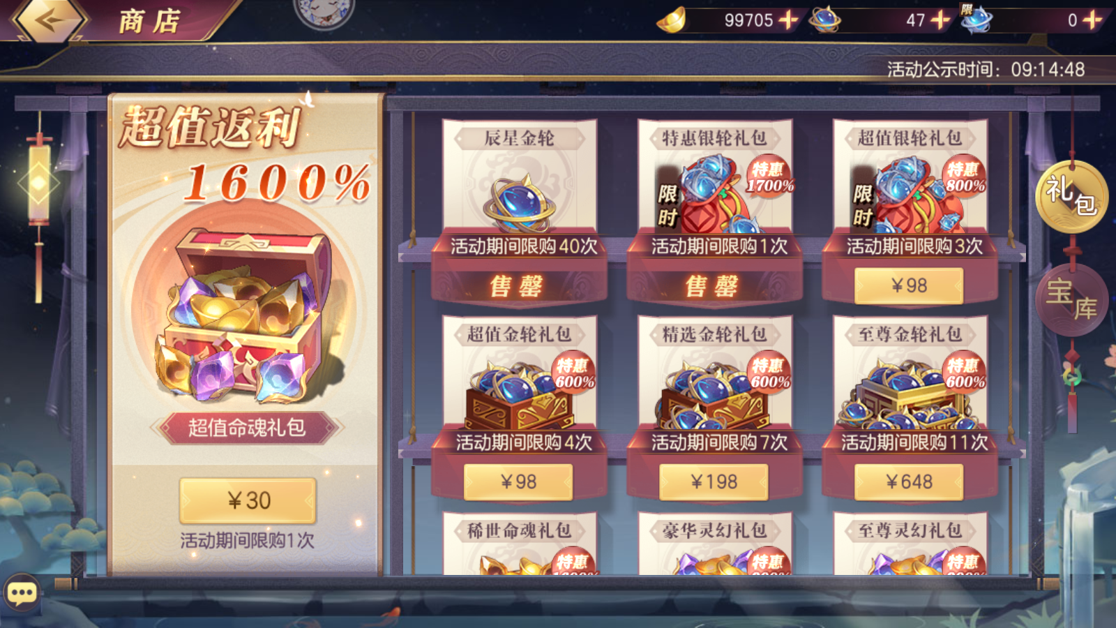⑨头彩送吉:新出的活动,活动设置有问题,过于看脸,用于补善灵和氪金风物,不谈那看脸的东西,实际氪金性价比尚可。