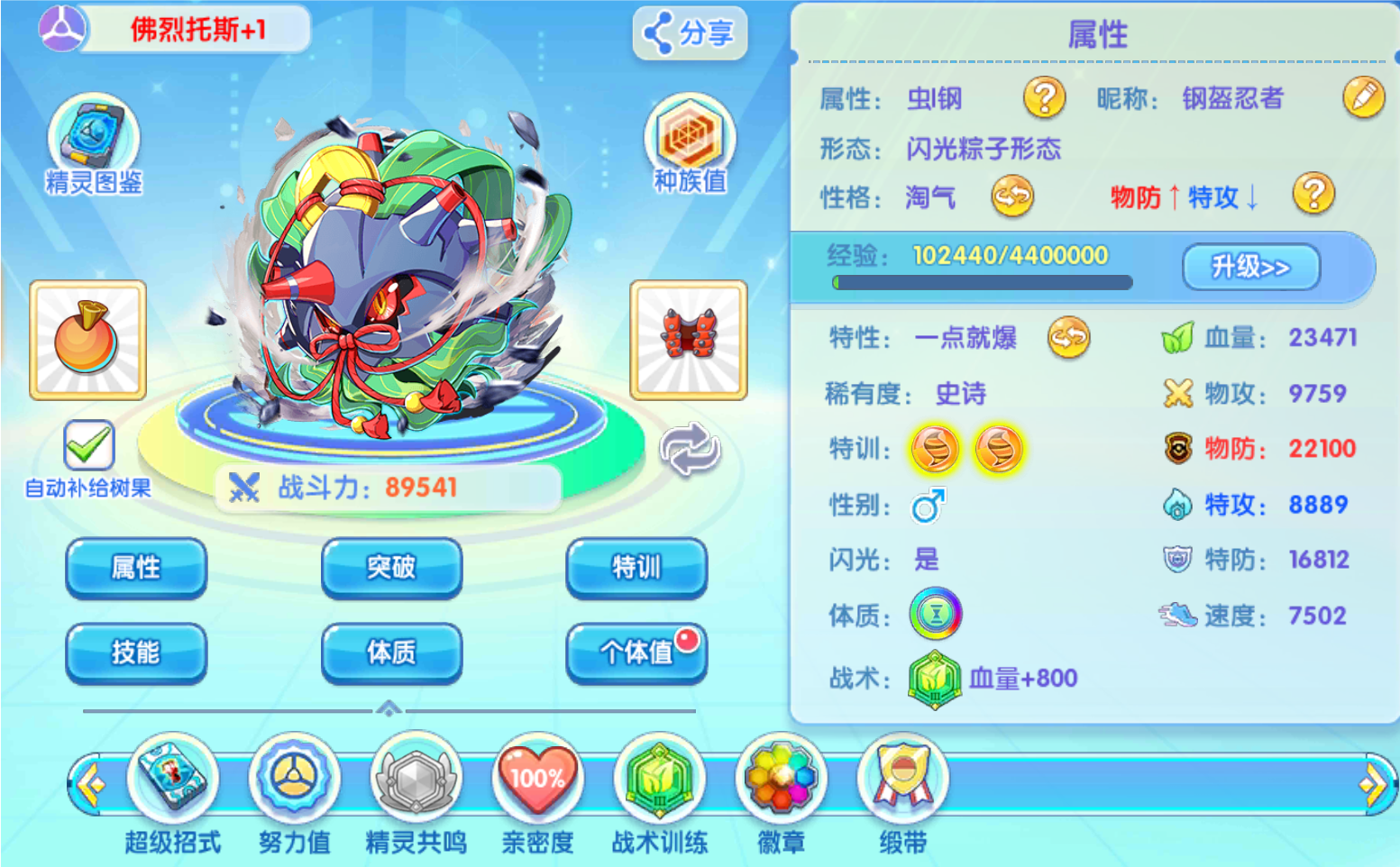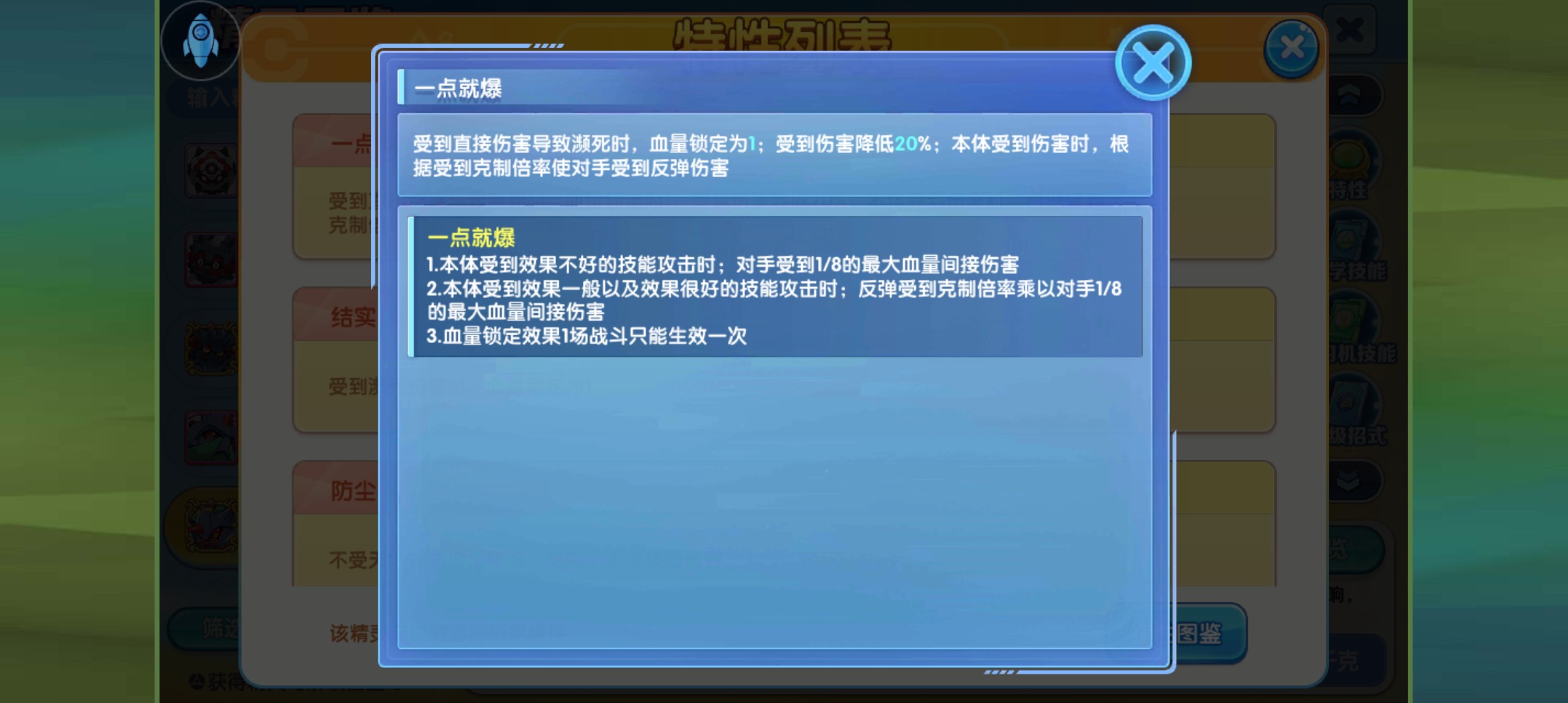 性格:大胆、悠闲、狂妄、慎重、淘气、沉着,性格:血量特防,血量物防,道具:所有反伤道具、幸运饺子、火炬杯锁链,特性:一点就爆,特殊系统:超级返拳